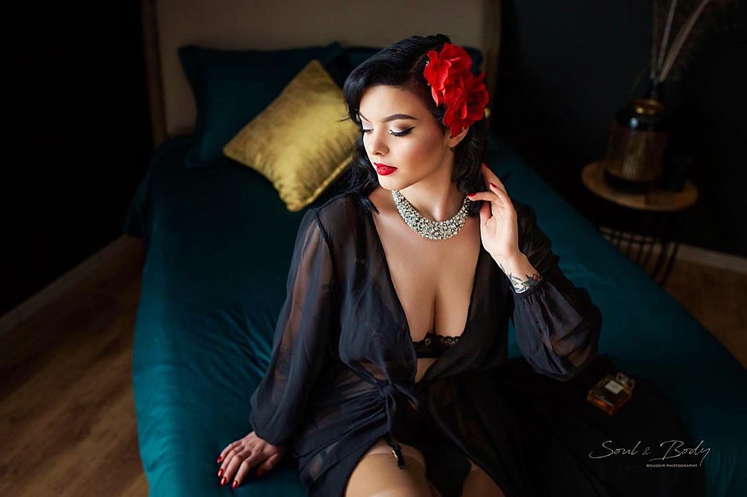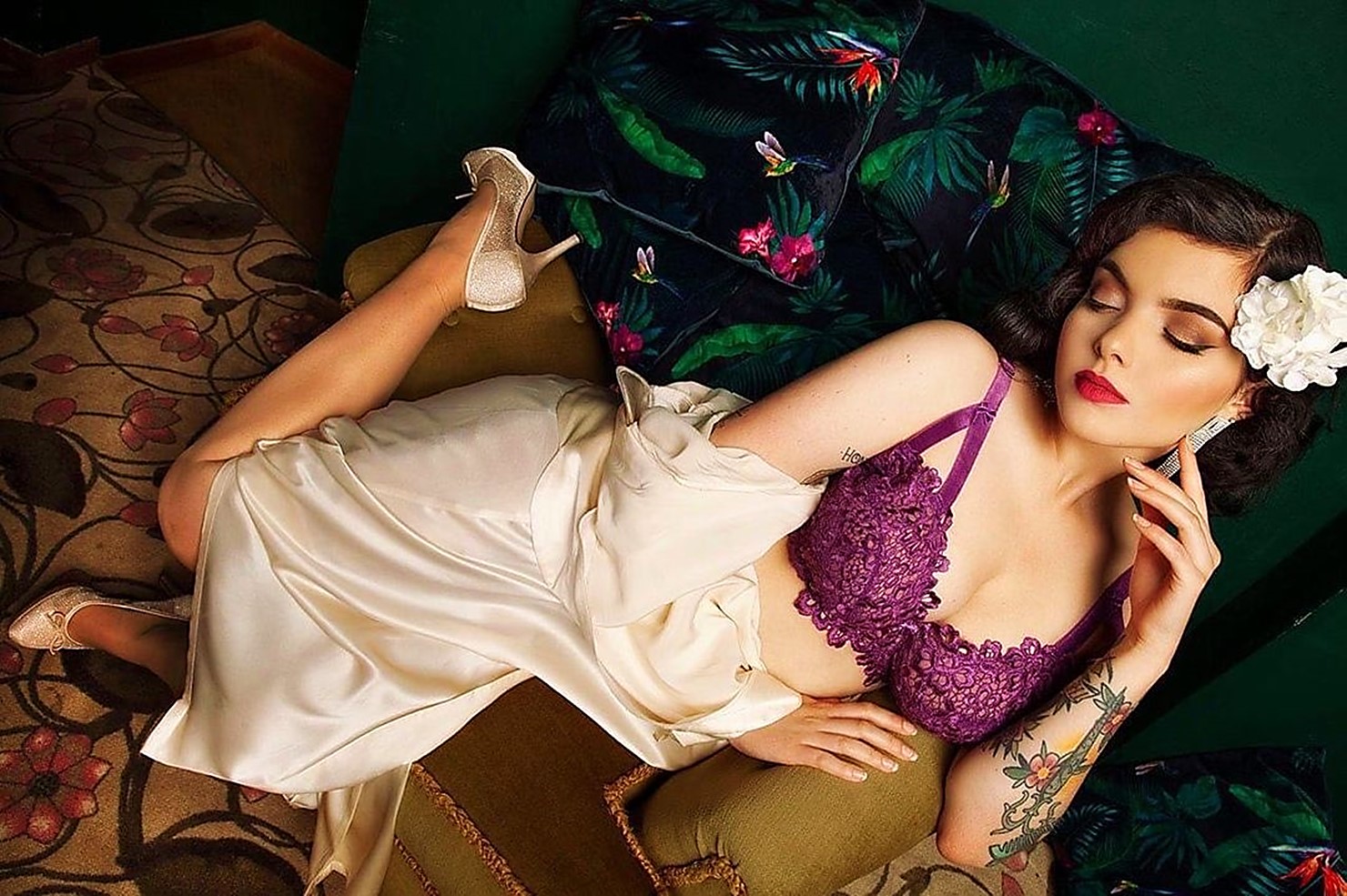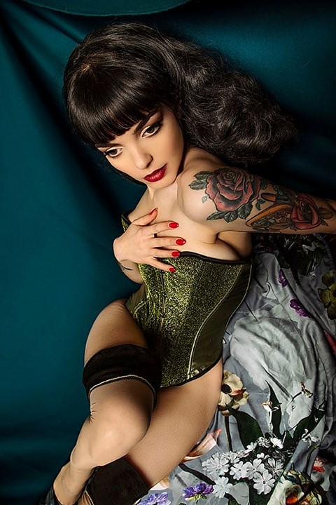 Pour un shooting photo, elle nous emmène dans son monde au look délicieusement rétro reflétant son admiration pour Dita Von Teese, Bettie Page et Rita Hayworth.
